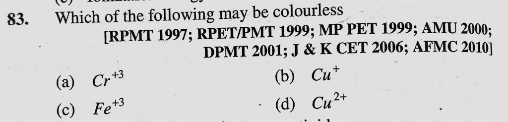 Which of the following may be colourless (a) Cr +3 (b) Cu + (c) Fe +3 (d) Cu 2+ Which of the following may be colourless (a) Cr +3 (b) Cu + (c) Fe +3 (d) Cu 2+ November 30, 2020 Category: Uncategorised (JEE Advanced Physics by BM Sharma + GMP Solutions) , Facebook Messenger WhatsApp Share this:TwitterFacebook Related