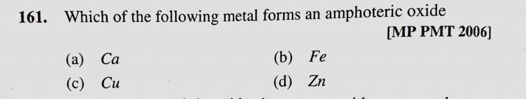 Which of the following metal forms an amphoteric oxide (a) Ca (b) Fe (c) Cu (d) Zn Which of the following metal forms an amphoteric oxide (a) Ca (b) Fe (c) Cu (d) Zn December 1, 2020 Category: Uncategorised (JEE Advanced Physics by BM Sharma + GMP Solutions) , Facebook Messenger WhatsApp Share this:TwitterFacebook Related