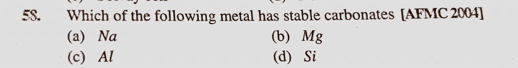Which of the following metal has stable carbonates (a) Na (b) Mg (c) Al (d) Si Which of the following metal has stable carbonates (a) Na (b) Mg (c) Al (d) Si November 13, 2020 Category: Uncategorised (JEE Advanced Physics by BM Sharma + GMP Solutions) , Facebook Messenger WhatsApp Share this:TwitterFacebook Related