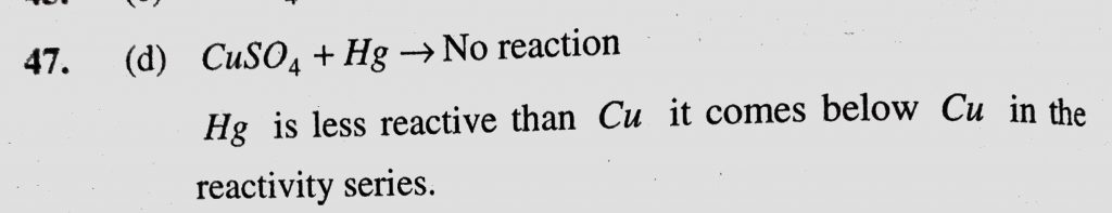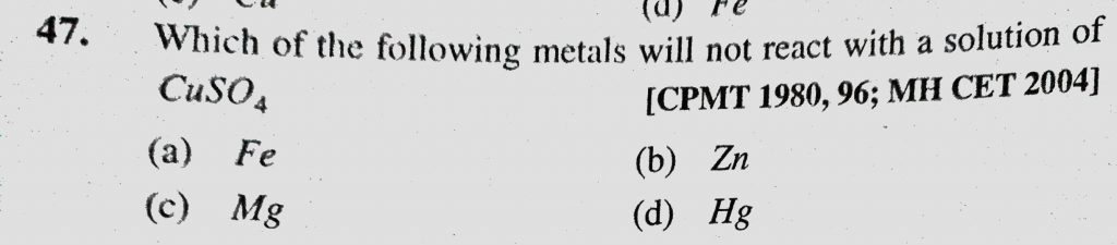 Which of the following metals will not react with a solution of CuSO4 (a) Fe (b) Zn (c) Mg (d) Hg Which of the following metals will not react with a solution of CuSO4 (a) Fe (b) Zn (c) Mg (d) Hg December 1, 2020 Category: Uncategorised (JEE Advanced Physics by BM Sharma + GMP Solutions) , Facebook Messenger WhatsApp Share this:TwitterFacebook Related