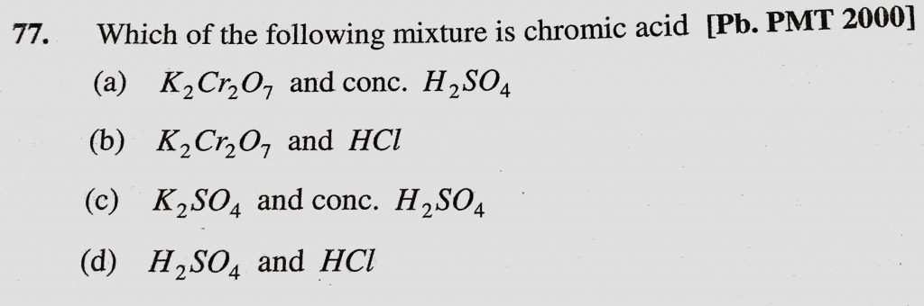 Which of the following mixture is chromic acid (a) K2Cr2O7 and conc. H2SO4 (b) K2Cr2O7 and HCl (c) K2SO4 and conc. H2SO4 Which of the following mixture is chromic acid (a) K2Cr2O7 and conc. H2SO4 (b) K2Cr2O7 and HCl (c) K2SO4 and conc. H2SO4 November 23, 2020 Category: Uncategorised (JEE Advanced Physics by BM Sharma + GMP Solutions) , Facebook Messenger WhatsApp Share this:TwitterFacebook Related