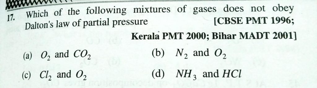 Which of the following mixtures of gases does not obey Dalton’s law of partial pressure (a) O2 and CO2 (b) N2 and O2 (c) Cl2 and O2 (d) NH3 and HCl Which of the following mixtures of gases does not obey Dalton's law of partial pressure (a) O2 and CO2 (b) N2 and O2 (c) Cl2 and O2 (d) NH3 and HCl February 10, 2021 Category: Uncategorised (JEE Advanced Physics by BM Sharma + GMP Solutions) , Facebook Messenger WhatsApp Share this:TwitterFacebook Related