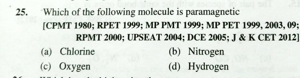 Which of the following molecule is paramagnetic (a) Chlorine (b) Nitrogen (c) oxygen (d) hydrogen Which of the following molecule is paramagnetic (a) Chlorine (b) Nitrogen (c) oxygen (d) hydrogen December 8, 2020 Category: Uncategorised (JEE Advanced Physics by BM Sharma + GMP Solutions) , Facebook Messenger WhatsApp Share this:TwitterFacebook Related