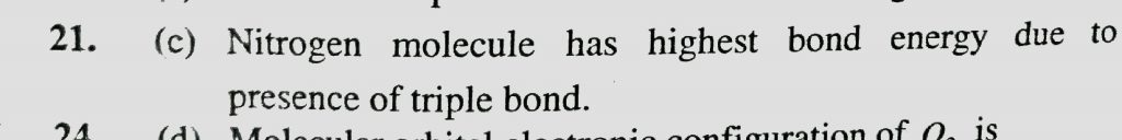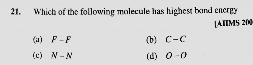 Which of the following molecule has highest bond energy (a) F – F (b) C – C (c) N – N (d) O – O Which of the following molecule has highest bond energy (a) F - F (b) C - C (c) N - N (d) O - O December 8, 2020 Category: Uncategorised (JEE Advanced Physics by BM Sharma + GMP Solutions) , Facebook Messenger WhatsApp Share this:TwitterFacebook Related