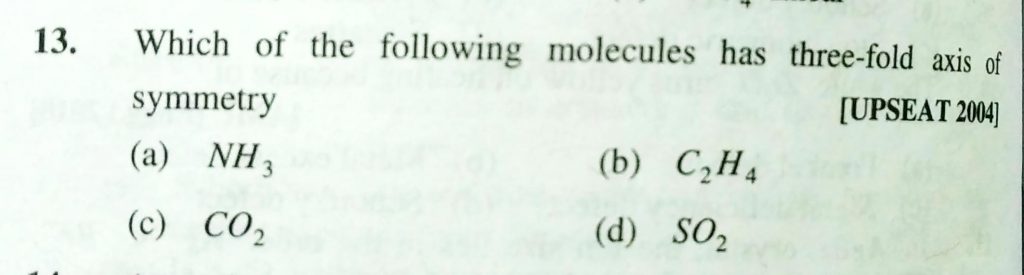 Which of the following molecules has three – fold axis of symmetry (a) NH3 (b) C2H4 (c) CO2 (d) SO2 Which of the following molecules has three- fold axis of symmetry (a) NH3 (b) C2H4 (c) CO2 (d) SO2 February 9, 2021 Category: Uncategorised (JEE Advanced Physics by BM Sharma + GMP Solutions) , Facebook Messenger WhatsApp Share this:TwitterFacebook Related