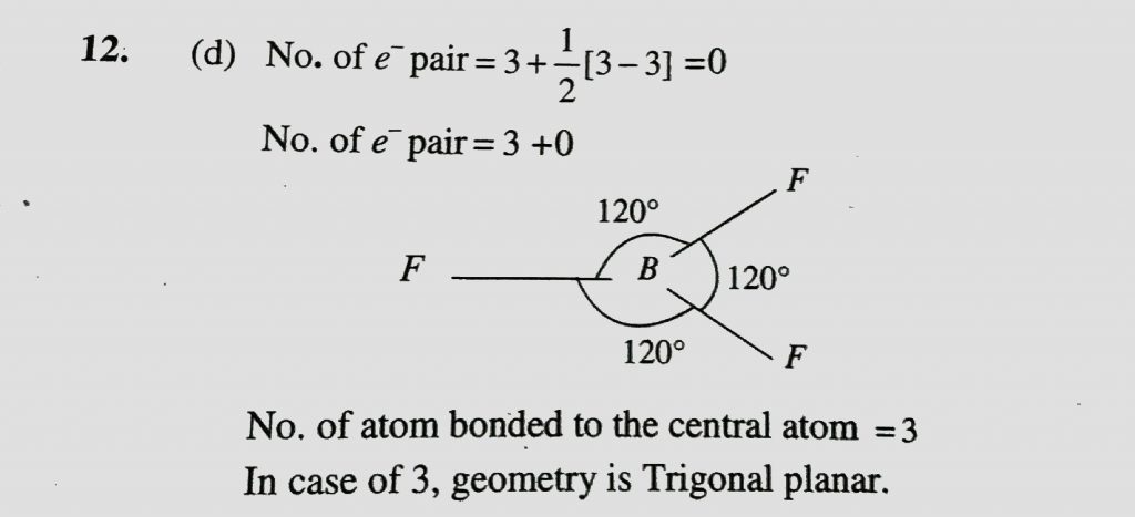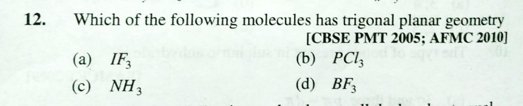 Which of the following molecules has trigonal planar geometry (a) IF3 (b) PCL3 (c) NH3 (d) BF3 Which of the following molecules has trigonal planar geometry (a) IF3 (b) PCL3 (c) NH3 (d) BF3 December 2, 2020 Category: Uncategorised (JEE Advanced Physics by BM Sharma + GMP Solutions) , Facebook Messenger WhatsApp Share this:TwitterFacebook Related