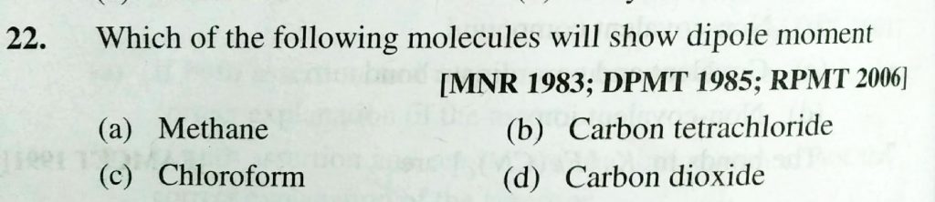 Which of the following molecules will show dipole moment (a) Methane (b) Carbon tetrachloride (c) Chloroform (d) Carbon dioxide Which of the following molecules will show dipole moment (a) Methane (b) Carbon tetrachloride (c) Chloroform (d) Carbon dioxide December 2, 2020 Category: Uncategorised (JEE Advanced Physics by BM Sharma + GMP Solutions) , Facebook Messenger WhatsApp Share this:TwitterFacebook Related