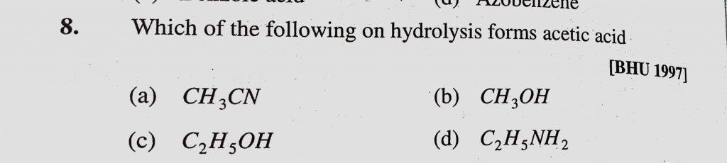 Which of the following on hydrolysis forms acetic acid (a) CH3CN (b) CH3OH (c) C2H5OH (d) C2H5NH2 Which of the following on hydrolysis forms acetic acid (a) CH3CN (b) CH3OH (c) C2H5OH (d) C2H5NH2 February 12, 2021 Category: Uncategorised (JEE Advanced Physics by BM Sharma + GMP Solutions) , Facebook Messenger WhatsApp Share this:TwitterFacebook Related