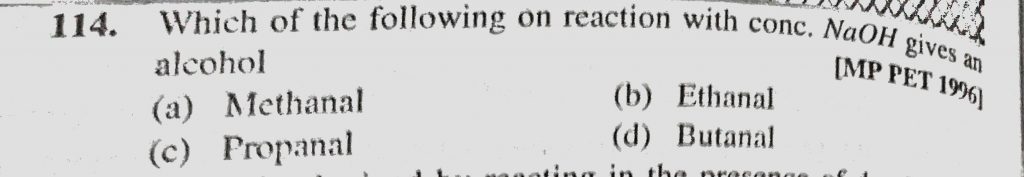Which of the following on reaction with conc. NaOH gives an alcohol (a) Methanal (b) Ethanal (c) Propanal (d) Butanal Which of the following on reaction with conc. NaOH gives an alcohol (a) Methanal (b) Ethanal (c) Propanal (d) Butanal February 12, 2021 Category: Uncategorised (JEE Advanced Physics by BM Sharma + GMP Solutions) , Facebook Messenger WhatsApp Share this:TwitterFacebook Related