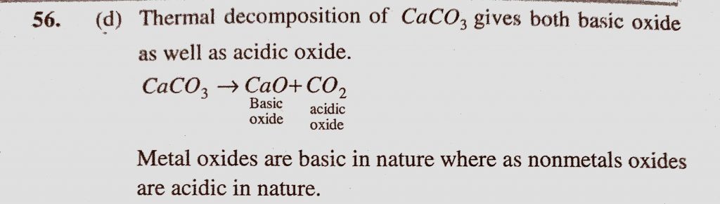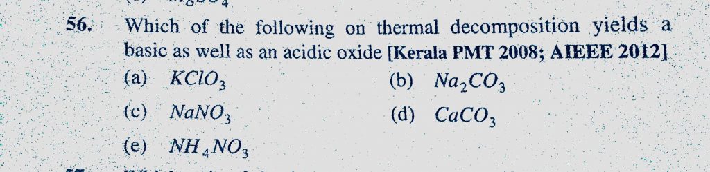 Which of the following on thermal decomposition yields a basic as well as an acidic oxide (a) KClO3 (b) Na2CO3 (c) NaNO3 (d) CaCO3 Which of the following on thermal decomposition yields a basic as well as an acidic oxide (a) KClO3 (b) Na2CO3 (c) NaNO3 (d) CaCO3 November 15, 2020 Category: Uncategorised (JEE Advanced Physics by BM Sharma + GMP Solutions) , Facebook Messenger WhatsApp Share this:TwitterFacebook Related