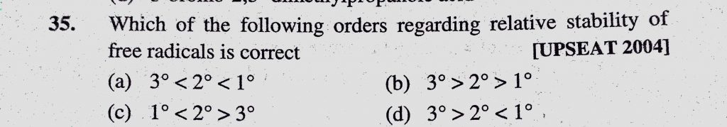 Which of the following orders regarding relative stability of free radicals is correct (a) 3 < 2 2 > 1 Which of the following orders regarding relative stability of free radicals is correct (a) 3 < 2 2 > 1 December 11, 2020 Category: Uncategorised (JEE Advanced Physics by BM Sharma + GMP Solutions) , Facebook Messenger WhatsApp Share this:TwitterFacebook Related