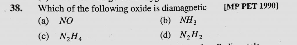Which of the following oxide is diamagnetic (a) NO (b) NH3 (c) N2H4 (d) N2H2 Which of the following oxide is diamagnetic (a) NO (b) NH3 (c) N2H4 (d) N2H2 November 27, 2020 Category: Uncategorised (JEE Advanced Physics by BM Sharma + GMP Solutions) , Facebook Messenger WhatsApp Share this:TwitterFacebook Related
