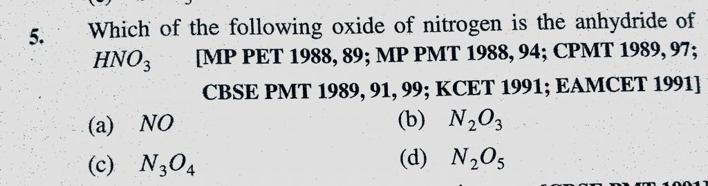 Which of the following oxide of nitrogen is the anhydride of HNO3 (a) NO (b) N2O3 (c) N3O4 (d) N2O5 Which of the following oxide of nitrogen is the anhydride of HNO3 (a) NO (b) N2O3 (c) N3O4 (d) N2O5 November 18, 2020 Category: Uncategorised (JEE Advanced Physics by BM Sharma + GMP Solutions) , Facebook Messenger WhatsApp Share this:TwitterFacebook Related