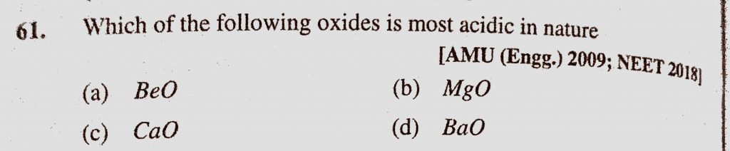 Which of the following oxides is most acidic in nature (a) BeO (b) MgO (c) CaO (d) BaO Which of the following oxides is most acidic in nature (a) BeO (b) MgO (c) CaO (d) BaO November 15, 2020 Category: Uncategorised (JEE Advanced Physics by BM Sharma + GMP Solutions) , Facebook Messenger WhatsApp Share this:TwitterFacebook Related