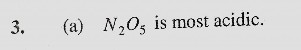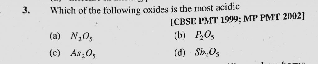 Which of the following oxides is the most acidic (a) N2O5 (b) P2O5 (c) As2O5 (d) Sb2O5 Which of the following oxides is the most acidic (a) N2O5 (b) P2O5 (c) As2O5 (d) Sb2O5 November 25, 2020 Category: Uncategorised (JEE Advanced Physics by BM Sharma + GMP Solutions) , Facebook Messenger WhatsApp Share this:TwitterFacebook Related