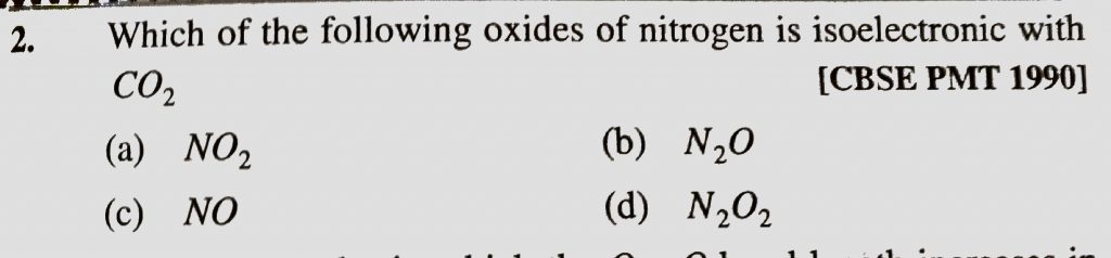 Which of the following oxides of nitrogen is isoelectronic with CO2 (a) NO2 (b) N2O (c) NO (d) N2O2 Which of the following oxides of nitrogen is isoelectronic with CO2 (a) NO2 (b) N2O (c) NO (d) N2O2 December 7, 2020 Category: Uncategorised (JEE Advanced Physics by BM Sharma + GMP Solutions) , Facebook Messenger WhatsApp Share this:TwitterFacebook Related