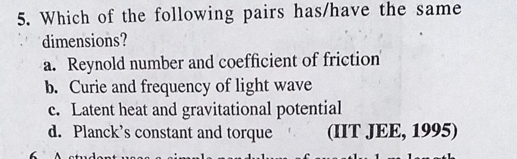Which of the following pairs has/have the same dimensions? a. Reynold number and coefficient of friction b. Curie and frequency of light wave Which of the following pairs has/have the same dimensions? a. Reynold number and coefficient of friction b. Curie and frequency of light wave September 16, 2020 Category: Uncategorised (JEE Advanced Physics by BM Sharma + GMP Solutions) , Facebook Messenger WhatsApp Share this:TwitterFacebook Related