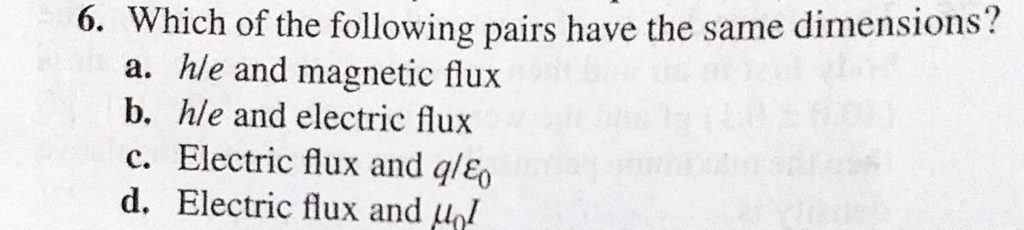 Which of the following pairs have the same dimensions? a. h/e and magnetic flux b. h/e and electric flux c. Electric flux and Which of the following pairs have the same dimensions? a. h/e and magnetic flux b. h/e and electric flux c. Electric flux and September 15, 2020 Category: Uncategorised (JEE Advanced Physics by BM Sharma + GMP Solutions) , Facebook Messenger WhatsApp Share this:TwitterFacebook Related