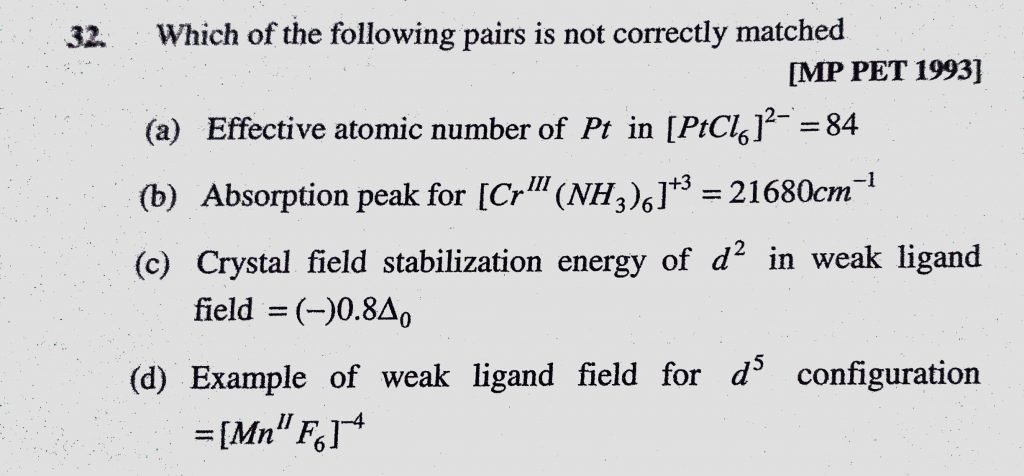 Which of the following pairs is not correctly matched (a) Effective atomic number of Pt in (PtCl6) 2- = 84 (b) Absorption peak for (Cr III(NH3)6)+3 = 21680/cm Which of the following pairs is not correctly matched (a) Effective atomic number of Pt in (PtCl6) 2- = 84 (b) Absorption peak for (Cr III(NH3)6)+3 = 21680/cm December 4, 2020 Category: Uncategorised (JEE Advanced Physics by BM Sharma + GMP Solutions) , Facebook Messenger WhatsApp Share this:TwitterFacebook Related