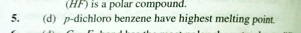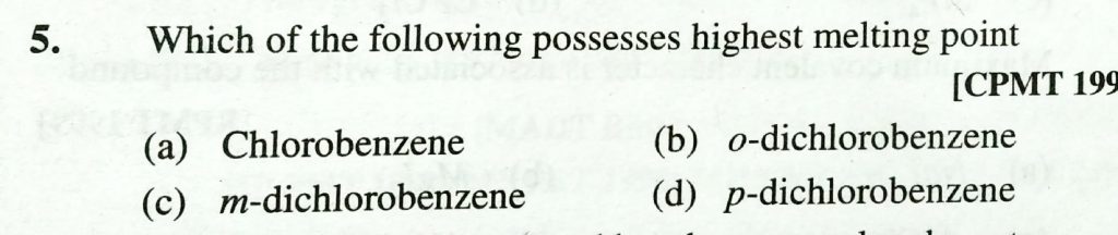 Which of the following possesses highest melting point (a) CHlorobezene (b) o – dichlorobenzene (c) m – dichlorobezene (d) P – dich;lorobenzene Which of the following possesses highest melting point (a) CHlorobezene (b) o - dichlorobenzene (c) m - dichlorobezene (d) P - dich;lorobenzene December 2, 2020 Category: Uncategorised (JEE Advanced Physics by BM Sharma + GMP Solutions) , Facebook Messenger WhatsApp Share this:TwitterFacebook Related