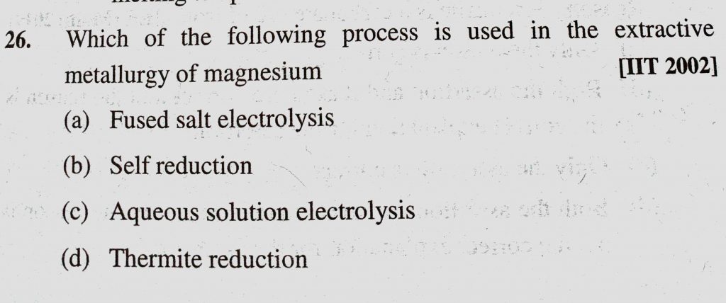 Which of the following process is used in the extractive metallurgy of magnisium (a) Fused salt electrolysis (b) Self reduction (c) Aqueous solution electrolysis Which of the following process is used in the extractive metallurgy of magnisium (a) Fused salt electrolysis (b) Self reduction (c) Aqueous solution electrolysis November 12, 2020 Category: Uncategorised (JEE Advanced Physics by BM Sharma + GMP Solutions) , Facebook Messenger WhatsApp Share this:TwitterFacebook Related