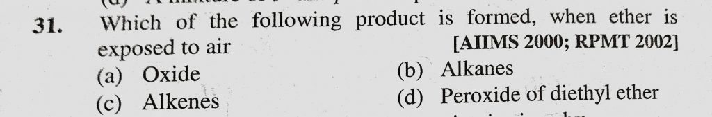 Which of the following product is formed, when ether is exposed to air (a) Oxide (b) Alkanes (c) Alkenes (d) Peroxide of diethyl ether when ether is exposed to air (a) Oxide (b) Alkanes (c) Alkenes (d) Peroxide of diethyl ether Which of the following product is formed February 10, 2021 Category: Uncategorised (JEE Advanced Physics by BM Sharma + GMP Solutions) , Facebook Messenger WhatsApp Share this:TwitterFacebook Related