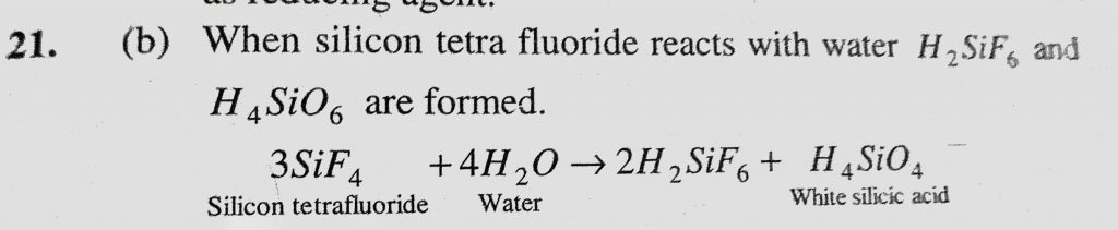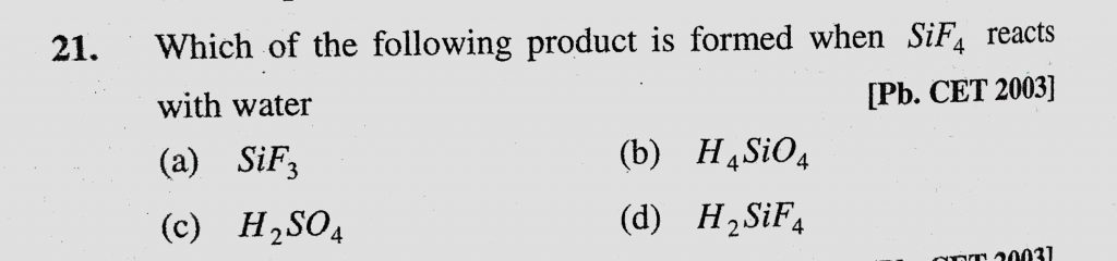 Which of the following product is formed when SiF4 reacts with water (a) SiF3 (b) H4SiO4 Which of the following product is formed when SiF4 reacts with water (a) SiF3 (b) H4SiO4 November 25, 2020 Category: Uncategorised (JEE Advanced Physics by BM Sharma + GMP Solutions) , Facebook Messenger WhatsApp Share this:TwitterFacebook Related