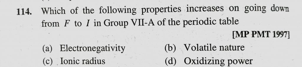 Which of the following properties increases on going down from F to I in Group vII-A of the periodic table (a) Electronegativity (b) Volatile nature (c) Ionic radius Which of the following properties increases on going down from F to I in Group vII-A of the periodic table (a) Electronegativity (b) Volatile nature (c) Ionic radius November 24, 2020 Category: Uncategorised (JEE Advanced Physics by BM Sharma + GMP Solutions) , Facebook Messenger WhatsApp Share this:TwitterFacebook Related