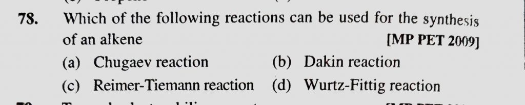 Which of the following reactions can be used for the synthesis of an alkene (a) Chugaev reaction (b) Dakin reaction (c) Reimer-Tiemann reaction (d) Wurtz-Fitting reaction Which of the following reactions can be used for the synthesis of an alkene (a) Chugaev reaction (b) Dakin reaction (c) Reimer-Tiemann reaction (d) Wurtz-Fitting reaction December 13, 2020 Category: Uncategorised (JEE Advanced Physics by BM Sharma + GMP Solutions) , Facebook Messenger WhatsApp Share this:TwitterFacebook Related