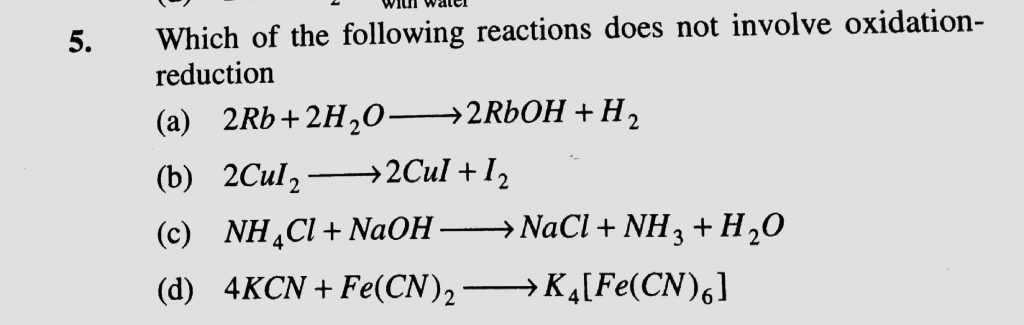 Which of the following reactions does not involve oxidation reduction Which of the following reactions does not involve oxidation reduction November 25, 2020 Category: Uncategorised (JEE Advanced Physics by BM Sharma + GMP Solutions) , Facebook Messenger WhatsApp Share this:TwitterFacebook Related