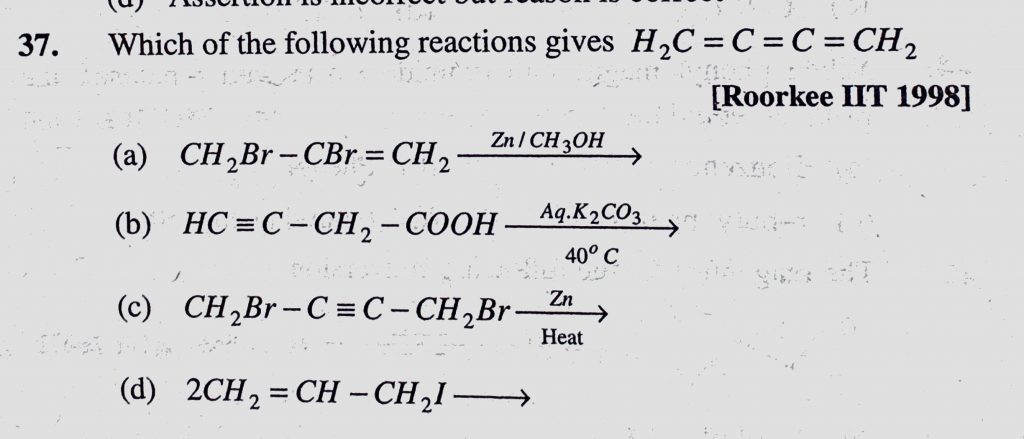 Which of the following reactions gives H2C = C = C = CH2 (a) CH2Br – CBr = CH2 (b) HC =_ C – CH2 – COOH Which of the following reactions gives H2C = C = C = CH2 (a) CH2Br - CBr = CH2 (b) HC =_ C - CH2 - COOH February 9, 2021 Category: Uncategorised (JEE Advanced Physics by BM Sharma + GMP Solutions) , Facebook Messenger WhatsApp Share this:TwitterFacebook Related