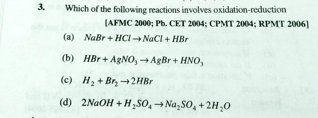 Which of the following reactions involve oxidation – reduction (a) NaBr +HCL gives NaCL +HBr (b) HBr + AgNO3 gives AgBr +HNO3 (c) H2 +Br gives 2HBr (d) 2NaOH +H2SO4 gives Na2SO4 +2H2O Which of the following reactions involve oxidation - reduction (a) NaBr +HCL gives NaCL +HBr (b) HBr + AgNO3 gives AgBr +HNO3 (c) H2 +Br gives 2HBr (d) 2NaOH +H2SO4 gives Na2SO4 +2H2O November 24, 2020 Category: Uncategorised (JEE Advanced Physics by BM Sharma + GMP Solutions) , Facebook Messenger WhatsApp Share this:TwitterFacebook Related