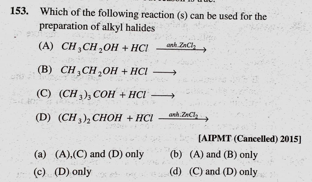 Which of the following reactions(s) can be used for the preparation of alkyl halides (A) CH3CH2OH + HCl (B) CH3CH2OH + HCl (C) (CH3)3 COH + HCl Which of the following reactions(s) can be used for the preparation of alkyl halides (A) CH3CH2OH + HCl (B) CH3CH2OH + HCl (C) (CH3)3 COH + HCl February 9, 2021 Category: Uncategorised (JEE Advanced Physics by BM Sharma + GMP Solutions) , Facebook Messenger WhatsApp Share this:TwitterFacebook Related