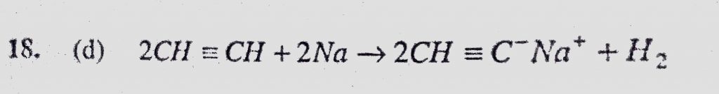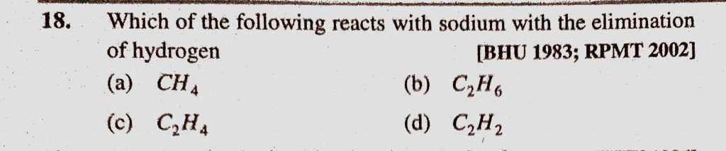 Which of the following reacts with sodium with the elimination of hydrogen (a) CH4 (b) C2H6 (c) C2H4 (d) C2H2 Which of the following reacts with sodium with the elimination of hydrogen (a) CH4 (b) C2H6 (c) C2H4 (d) C2H2 December 14, 2020 Category: Uncategorised (JEE Advanced Physics by BM Sharma + GMP Solutions) , Facebook Messenger WhatsApp Share this:TwitterFacebook Related