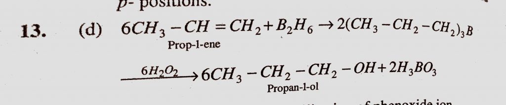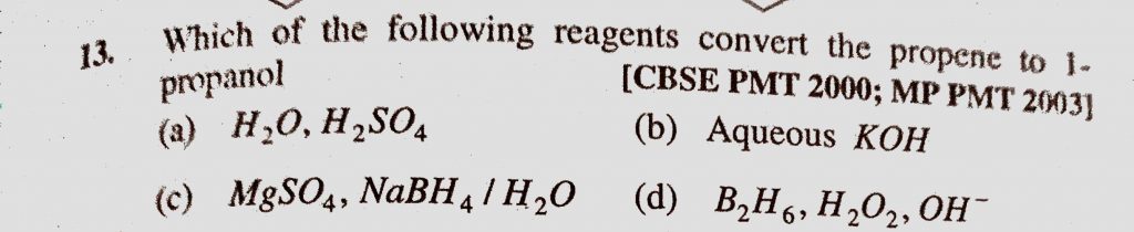 Which of the following reagents convert the propene to 1-propanol (a) H2O, H2SO4 (b) Aqueous KOH (c) MgSO4, NaBH4/ H2O (d) B2H6, H2O2, OH- H2O2 H2SO4 (b) Aqueous KOH (c) MgSO4 NaBH4/ H2O (d) B2H6 OH- Which of the following reagents convert the propene to 1-propanol (a) H2O February 10, 2021 Category: Uncategorised (JEE Advanced Physics by BM Sharma + GMP Solutions) , Facebook Messenger WhatsApp Share this:TwitterFacebook Related