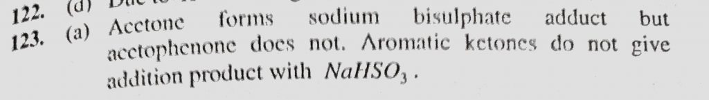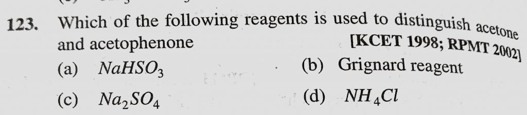 Which of the following reagents is used to distinguish acetone and acetophenone (a) NaHSO3 (b) Grignard reagent (c) Na2SO4 (d) NH4Cl Which of the following reagents is used to distinguish acetone and acetophenone (a) NaHSO3 (b) Grignard reagent (c) Na2SO4 (d) NH4Cl February 12, 2021 Category: Uncategorised (JEE Advanced Physics by BM Sharma + GMP Solutions) , Facebook Messenger WhatsApp Share this:TwitterFacebook Related