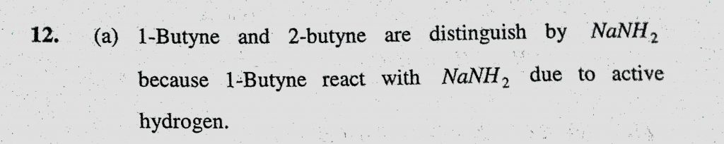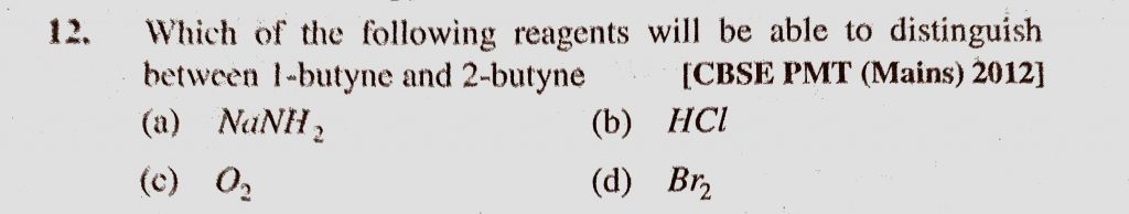 Which of the following reagents will be able to distinguish between 1-butyne and 2-butyne (a) NaNH2 (b) HCl (c) O2 (d) Br2 Which of the following reagents will be able to distinguish between 1-butyne and 2-butyne (a) NaNH2 (b) HCl (c) O2 (d) Br2 December 14, 2020 Category: Uncategorised (JEE Advanced Physics by BM Sharma + GMP Solutions) , Facebook Messenger WhatsApp Share this:TwitterFacebook Related