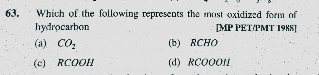 Which of the following represents the most oxidized form of hydrocarbon (a) CO2 (b) RCHO (c) RCOOH (d) RCOOOH Which of the following represents the most oxidized form of hydrocarbon (a) CO2 (b) RCHO (c) RCOOH (d) RCOOOH December 12, 2020 Category: Uncategorised (JEE Advanced Physics by BM Sharma + GMP Solutions) , Facebook Messenger WhatsApp Share this:TwitterFacebook Related
