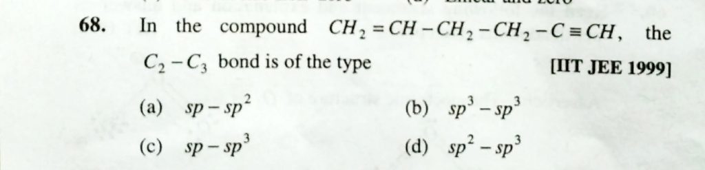 In teh compound CH2 = CH – CH2 – CH2 – C — CH, the C2 – C3 bond is of the type In teh compound CH2 = CH - CH2 - CH2 - C --- CH the C2 - C3 bond is of the type December 10, 2020 Category: Uncategorised (JEE Advanced Physics by BM Sharma + GMP Solutions) , Facebook Messenger WhatsApp Share this:TwitterFacebook Related