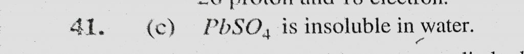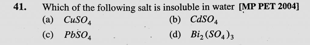 Which of the following salt is insoluble in water (a) CuSO4 (b) CdSO4 (c) PbSO4 (d) Bi2(SO4)3 Which of the following salt is insoluble in water (a) CuSO4 (b) CdSO4 (c) PbSO4 (d) Bi2(SO4)3 November 27, 2020 Category: Uncategorised (JEE Advanced Physics by BM Sharma + GMP Solutions) , Facebook Messenger WhatsApp Share this:TwitterFacebook Related
