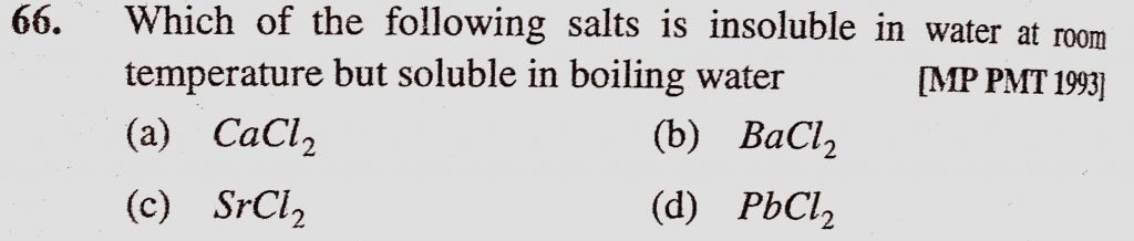 Which of the following salts is insoluble in water at room temperature but soluble in boiling water (a) CaCl2 (b) BaCl2 (c) SrCl2 (d) PbCl2 Which of the following salts is insoluble in water at room temperature but soluble in boiling water (a) CaCl2 (b) BaCl2 (c) SrCl2 (d) PbCl2 November 15, 2020 Category: Uncategorised (JEE Advanced Physics by BM Sharma + GMP Solutions) , Facebook Messenger WhatsApp Share this:TwitterFacebook Related