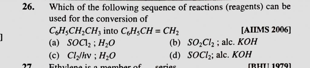 Which of the following sequence of reactions (reagents) can be used for the conversion of C6H5CH2CH3 into C6H5CH=CH2 (a) SOCl2 ; H2O (b) SO2Cl2 ; alc. KOH Which of the following sequence of reactions (reagents) can be used for the conversion of C6H5CH2CH3 into C6H5CH=CH2 (a) SOCl2 ; H2O (b) SO2Cl2 ; alc. KOH December 13, 2020 Category: Uncategorised (JEE Advanced Physics by BM Sharma + GMP Solutions) , Facebook Messenger WhatsApp Share this:TwitterFacebook Related