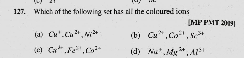 Which of the following set has all the coloured ions (a) Cu + , Cu 2+, Ni 2+ (b) Cu 2+ , Co 2+, Sc 3+ Co 2+ Cu 2+ Ni 2+ (b) Cu 2+ Sc 3+ Which of the following set has all the coloured ions (a) Cu + November 30, 2020 Category: Uncategorised (JEE Advanced Physics by BM Sharma + GMP Solutions) , Facebook Messenger WhatsApp Share this:TwitterFacebook Related