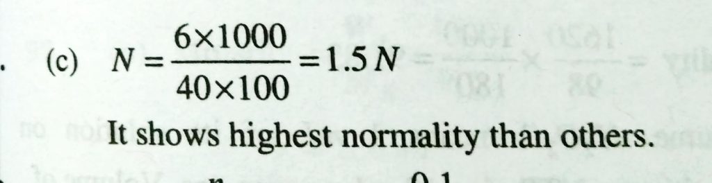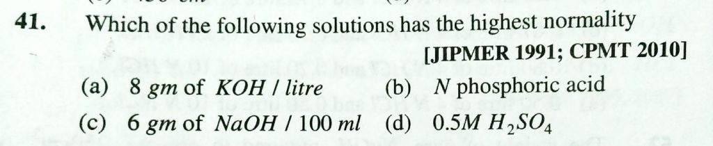 Which of the following solutions has the highest normality (a) 8 gm of KOH /litre (b) N phorsphric acid (C) 6 gm of NaOH / 100 ml (d) 0.5 M H2SO4 Which of the following solutions has the highest normality (a) 8 gm of KOH /litre (b) N phorsphric acid (C) 6 gm of NaOH / 100 ml (d) 0.5 M H2SO4 December 11, 2020 Category: Uncategorised (JEE Advanced Physics by BM Sharma + GMP Solutions) , Facebook Messenger WhatsApp Share this:TwitterFacebook Related