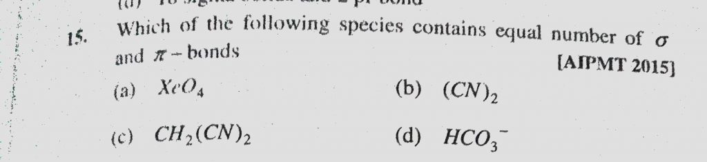 Which of the following species contains equal number of sigma and pie bonds (a) XeO4 (b) (CN)2 Which of the following species contains equal number of sigma and pie bonds (a) XeO4 (b) (CN)2 December 8, 2020 Category: Uncategorised (JEE Advanced Physics by BM Sharma + GMP Solutions) , Facebook Messenger WhatsApp Share this:TwitterFacebook Related