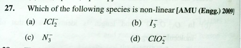 Which of the following species is non – linear (a) ICI2^- (b) I3^- (c) N3^- (d) CLO2^- Which of the following species is non - linear (a) ICI2^- (b) I3^- (c) N3^- (d) CLO2^- December 7, 2020 Category: Uncategorised (JEE Advanced Physics by BM Sharma + GMP Solutions) , Facebook Messenger WhatsApp Share this:TwitterFacebook Related