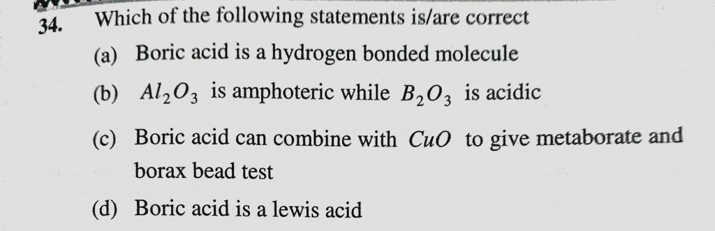 Which of the following statement is/are correct (a) Boric acid is a hydrogen bonded molecule (b) Al2O3 is amphoteric while B2O3 is acidic Which of the following statement is/are correct (a) Boric acid is a hydrogen bonded molecule (b) Al2O3 is amphoteric while B2O3 is acidic November 29, 2020 Category: Uncategorised (JEE Advanced Physics by BM Sharma + GMP Solutions) , Facebook Messenger WhatsApp Share this:TwitterFacebook Related