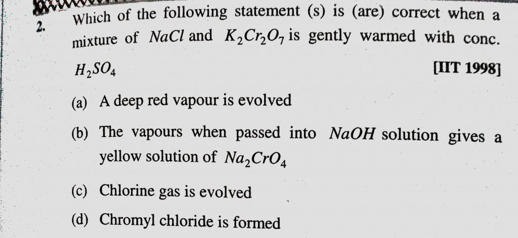 Which of the following statement (s) is (are) correct when a mixture of NaCl and K2Cr2O7 is gently warmed with conc. H2SO4 Which of the following statement (s) is (are) correct when a mixture of NaCl and K2Cr2O7 is gently warmed with conc. H2SO4 December 8, 2020 Category: Uncategorised (JEE Advanced Physics by BM Sharma + GMP Solutions) , Facebook Messenger WhatsApp Share this:TwitterFacebook Related
