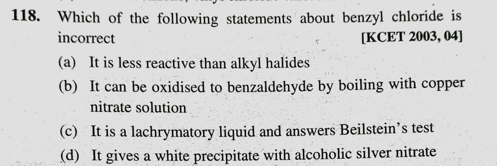 Which of the following statements about benzyl chloride is incorrect (a) It is less reactive than alkyl halides (b) It can be oxidised to benzaldehyde by boiling with copper nitrate solution Which of the following statements about benzyl chloride is incorrect (a) It is less reactive than alkyl halides (b) It can be oxidised to benzaldehyde by boiling with copper nitrate solution February 8, 2021 Category: Uncategorised (JEE Advanced Physics by BM Sharma + GMP Solutions) , Facebook Messenger WhatsApp Share this:TwitterFacebook Related