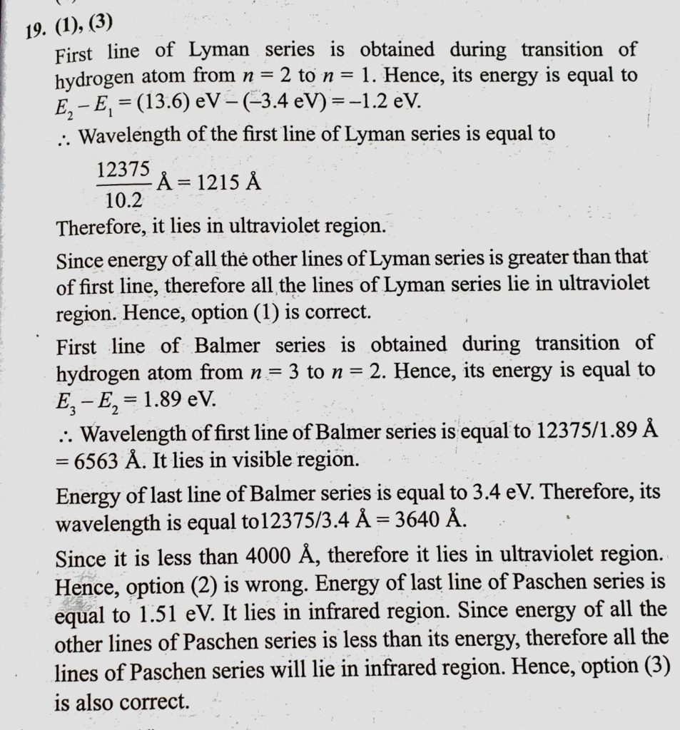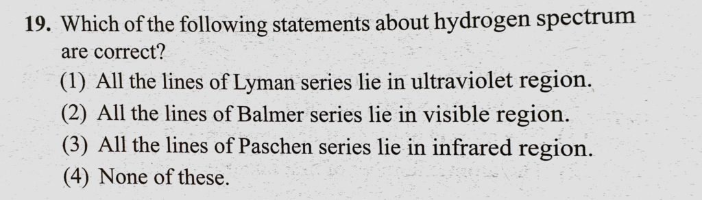 Which of the following statements about hydrogen spectrum are correct ? (1) All the lines of Lyman series lie in ultraviolet region. (2) All the lines in Balmer series lie in visible region. Which of the following statements about hydrogen spectrum are correct ? (1) All the lines of Lyman series lie in ultraviolet region. (2) All the lines in Balmer series lie in visible region. October 16, 2020 Category: Uncategorised (JEE Advanced Physics by BM Sharma + GMP Solutions) , Facebook Messenger WhatsApp Share this:TwitterFacebook Related